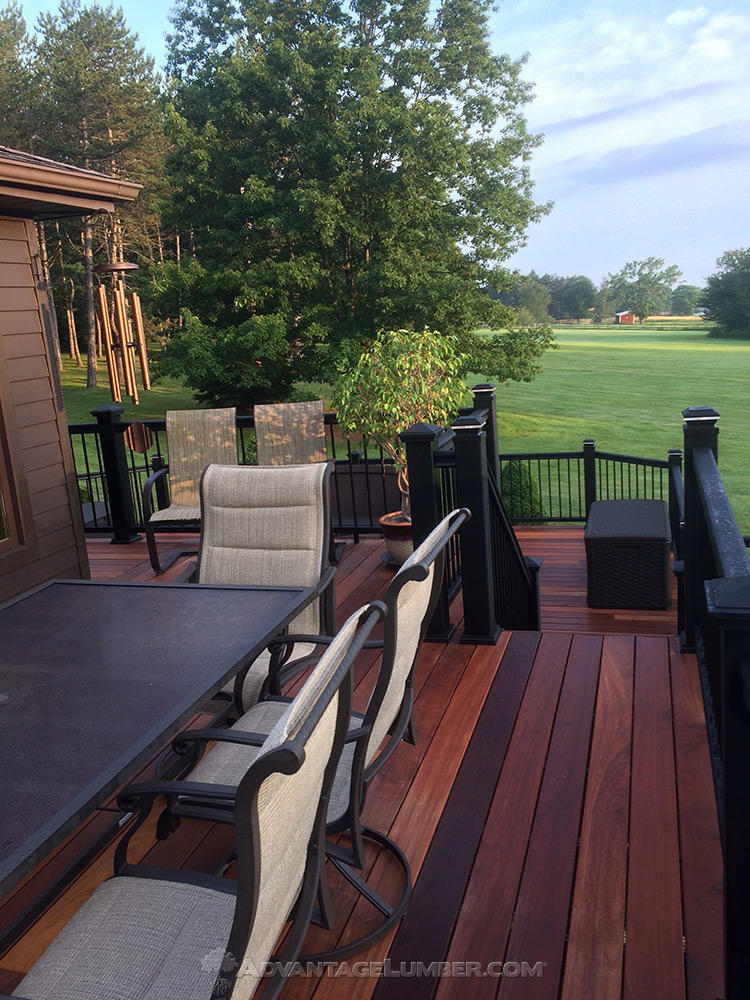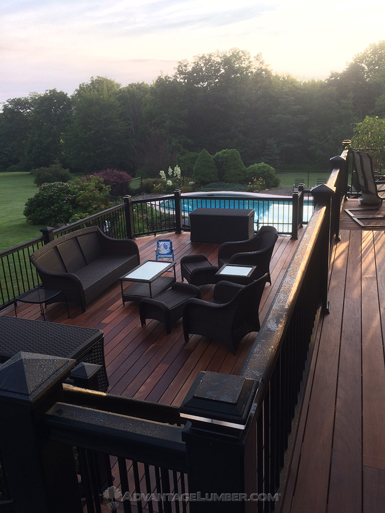 Orchard Park, New York - IPE deck, my wife and I took up the old pressure treated decking and installed new IPE with hidden fastness. We used deck wrap on all joists. The railings are Fiberon symnetry with aluminum balusters. This is three level to pool deck system lower area stamped concrete. Can not thank the people at Advantage lumber enough for all the help. If you are thinking of doing this yourself, you can, just takes a little extra time. My wife and I are in our sixty's, we did it.